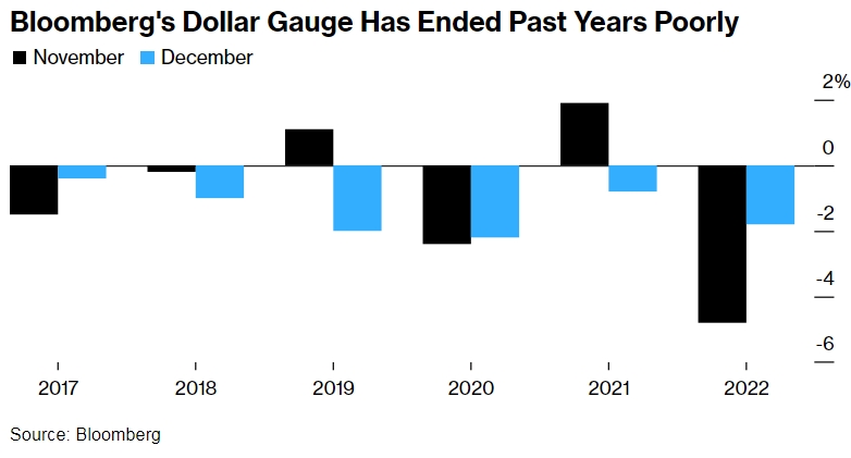 Спотовый индекс доллара Bloomberg падал каждый декабрь в течение последних шести лет подряд, в среднем примерно на 1,4%, причем его ослабление начиналось в ноябре четыре раза. Корзина азиатских валют по отношению к доллару в среднем прибавила около 1,2% как в ноябре, так и в декабре.