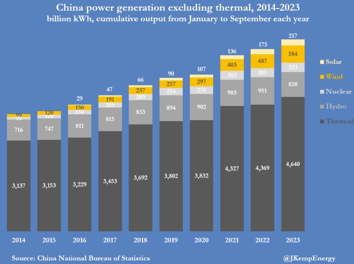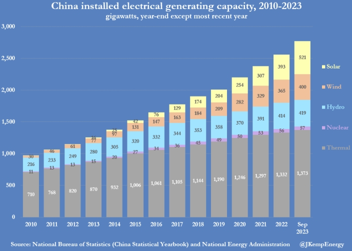 В 2023 году страна добавила 226 ГВт дополнительных генерирующих мощностей, что обусловлено огромным увеличением солнечной энергии (129 ГВт) при гораздо меньшем увеличении тепловой энергии (39 ГВт), ветровой (33 ГВт) и гидроэнергетики (8 ГВт).