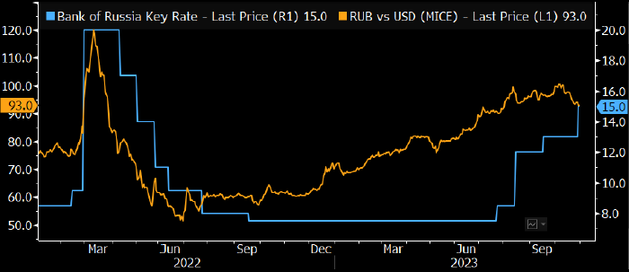 Резкое повышение ключевой ставки Банком России 27 октября должно ограничить экономический рост и инфляцию в стране в следующем году и тем самым поддержать рубль. Регулятор, очевидно, чувствует необходимость срочно купировать инфляционные риски, проистекающие из недавнего снижения курса рубля и ожидаемого роста госрасходов в 2024 году. Для этого ЦБ значительно ужесточил денежно-кредитную политику.