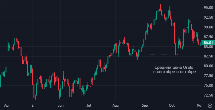 Средняя цена нефти Urals в январе—октябре 2023 года составила $61,84 за баррель.