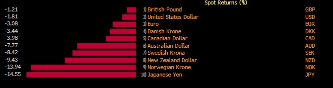 Как изменились валюты Большой десятки относительно франка с начала 2023 г по 31 октября.