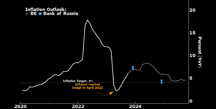 Сплошная белая линия — исторические данные по потребительской инфляции в РФ, белые точки — прогноз Bloomberg Economics, голубые точки — прогноз Банка России. Источник: Bloomberg