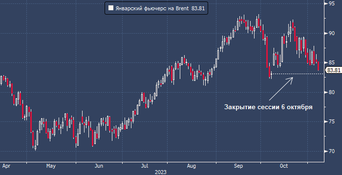Цены на нефть (январский фьючерс на Brent) почти полностью отыграли весь рост, последовавший за началом палестино-израильского конфликта 7 октября. В прошлую среду они достигли многонедельного минимума чуть выше $84,5 за баррель, а сегодня, после нескольких дней консолидации, котировки ушли ниже.