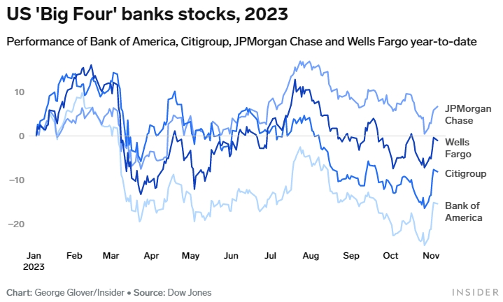 Другие банки «Большой четверки» — Citigroup , JPMorgan Chase и Wells Fargo — также понесли нереализованные убытки в десятки миллиардов долларов, согласно их отчетам о прибылях и убытках за второй и третий кварталы.
