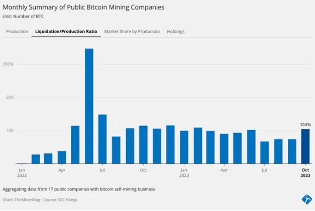 Поскольку проданная сумма превышала количество добытых биткойнов, соотношение ликвидации и производства биткойнов в октябре выросло до 104% с 70% летом, что позволяет предположить, что майнеры обратились к своим собственным запасам биткойнов, чтобы реализовать токены.