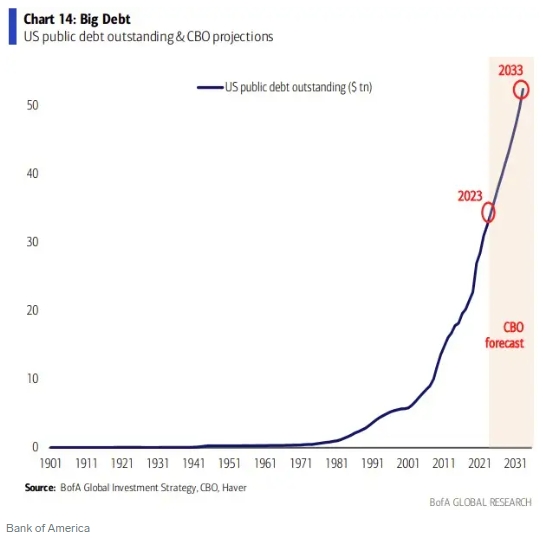 Государственный долг США в настоящее время составляет $33,6 трлн и, как ожидается, вырастет на $20 трлн до $54 трлн в течение следующего десятилетия на фоне «фискальной экспансии в 2020-х годах», заявил инвестиционный стратег Bank of America Майкл Хартнетт.