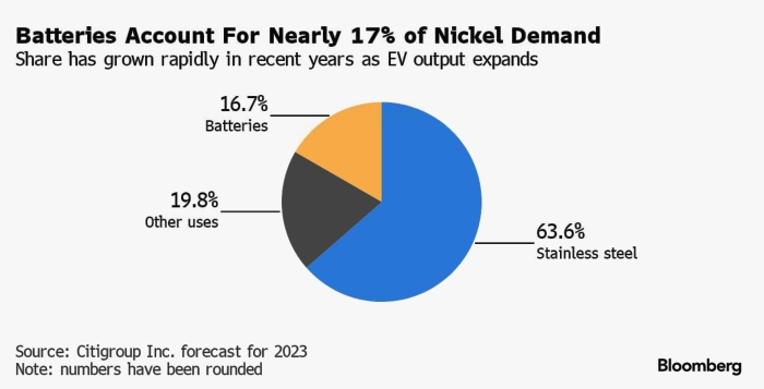 Никель дешевеет, поскольку в Индонезии растет производство никелевого чугуна, и объемы предложения увеличиваются в момент замедления потребления. Расширение мирового парка электромобилей происходит менее быстрыми темпами, чем ожидалось, и количество никеля, используемого автопромом, как и спрос на другие аккумуляторные металлы, такие как литий и кобальт.