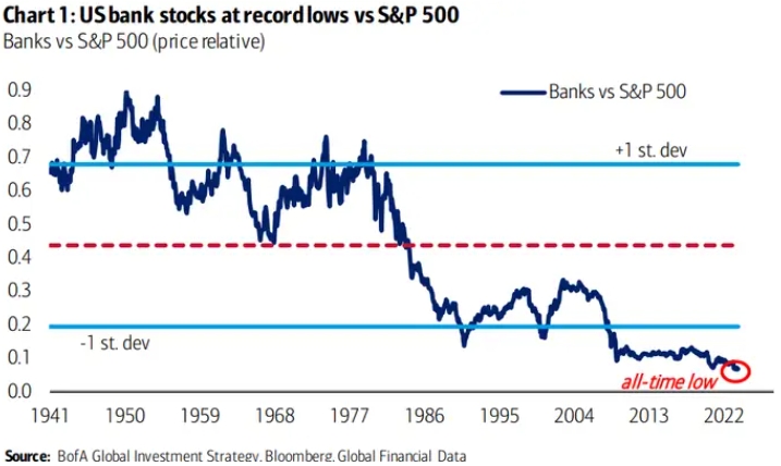 Наш график дня составлен Bank of America и показывает, что акции банков США достигли рекордно низкого уровня по сравнению с индексом S&P 500 более чем за 80 лет.