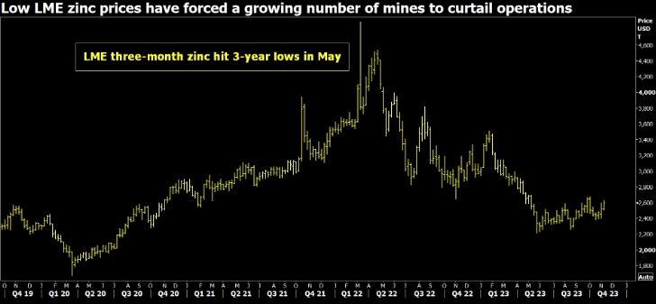 Цена на цинк на LME достигла трехлетнего минимума в 2215 долларов за метрическую тонну в мае, что вызвало ряд закрытий шахт.