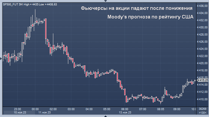 Фьючерсы на американские акции упали в понедельник после того, как агентство Moody’s Investors Service понизило прогноз кредитного рейтинга США со стабильного до негативного.