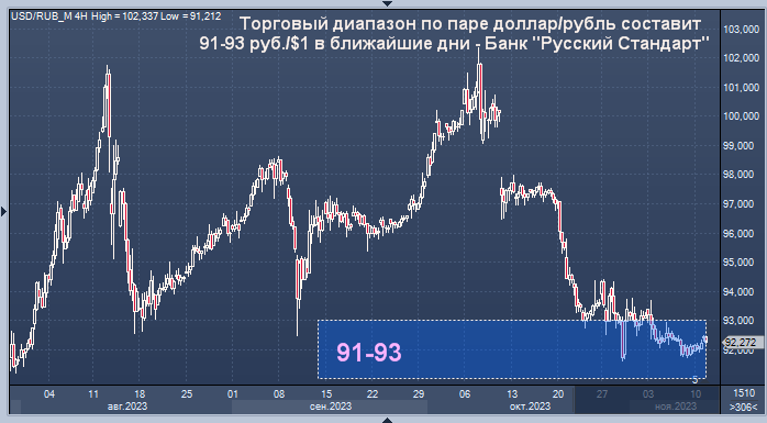 Торговый диапазон по паре доллар/рубль, скорее всего, составит в ближайшие дни 91-93 руб./$1, по паре евро/рубль -97,5-99,5 руб./EUR1, считает представитель банка "Русский Стандарт" Максим Тимошенко.