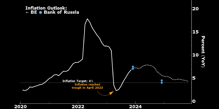 Сплошная белая линия — исторические данные по потребительской инфляции в РФ, белые точки — прогноз Bloomberg Economics, голубые точки — прогноз Банка России. Источник: Bloomberg