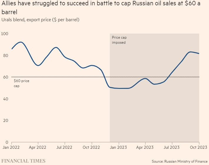 По словам западных чиновников и по данным по российскому экспорту, установленный США ценовой лимит на продажу нефти в России почти полностью игнорируется, что вынуждает страны искать пути усиления одной из своих ключевых экономических санкций против Москвы.
