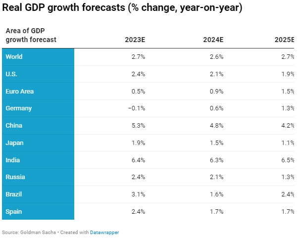 Goldman Sachs прогнозирует, что мировая экономика превзойдет ожидания в 2024 году благодаря сильному росту доходов и уверенности в том, что повышение ставок почти завершилось.