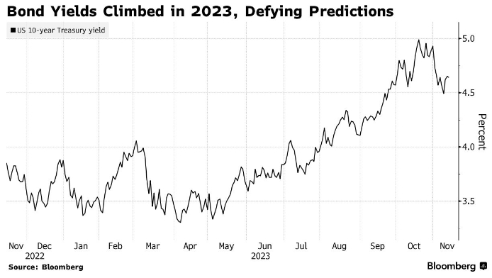 Рынок облигаций сбил инвесторов с толку в этом году, когда базовая доходность 10-летних казначейских облигаций выросла с примерно 3,87% до более чем 5%, а затем упала примерно до 4,5%. После семи повышений процентных ставок Федеральной резервной системой в 2022 году многие ожидали экономического спада в этом году, который подтолкнет центральный банк к снижению ставок. Вместо этого ФРС повысила ставки еще четыре раза, и председатель Джером Пауэлл подтвердил, что может последовать и еще больше, если уровень инфляции останется высоким.