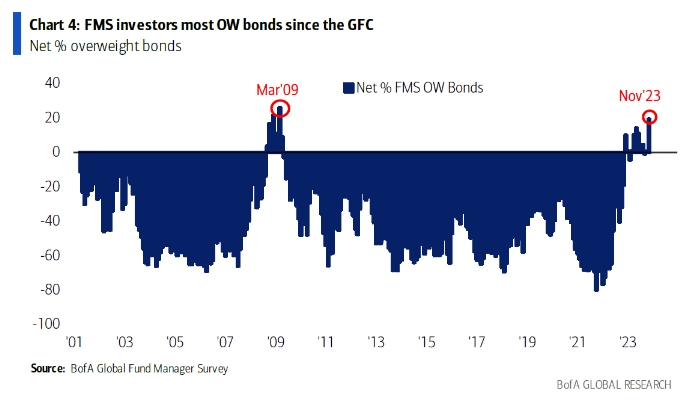 Pimco входит в число растущего числа инвесторов, удваивающих инвестиции в облигации, даже несмотря на то, что казначейские облигации находятся на пути к небывалому по меркам истории третьему году потерь подряд. Последний опрос управляющих фондами, проведенный Bank of America Corp., показывает, что группа стала наиболее оптимистичной в отношении облигаций со времен мирового финансового кризиса, основываясь на «большом убеждении» в том, что ставки снизятся в 2024 году.