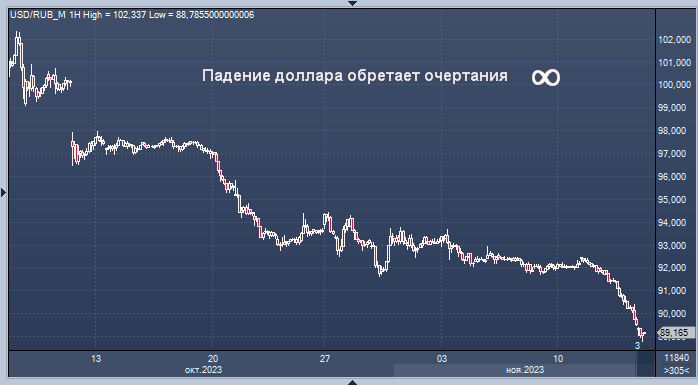 "Доллар вплотную приблизился к важной отметке 90 руб./$1, и уже в среду, как мы полагаем, способен ее проверить на прочность. Отметим, что прохождение указанного уровня технически способно открыть пространство для снижения в направлении 83-85 руб./$1 ближе к налоговым выплатам (28 ноября). Восстановлению позиций рубля может способствовать и ожидаемое нами постепенное ослабление импорта, выглядящее естественным в условиях текущих высоких ставок. В условиях ограниченности спроса на валюту со стороны импортеров и сохранения благоприятной конъюнктуры рынка нефти продажи валютной выручки экспортерами, в свою очередь, способны, по нашим оценкам, обеспечить достаточное для развития укрепления рубля предложение валюты на рынке", - писал утром аналитик Промсвязьбанка (ПСБ) Евгений Локтюхов.