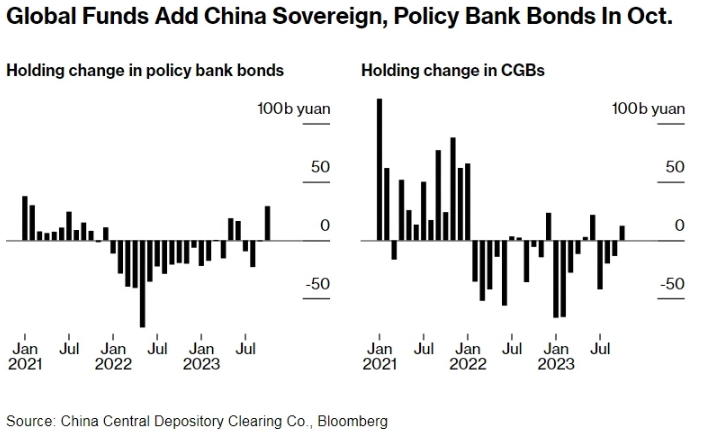 Данные China Central Depository & Clearing Co. Китая также показали, что в октябре зарубежные фонды купили китайских государственных облигаций на общую сумму 12,4 млрд юаней. По расчетам Bloomberg, они увеличили объем так называемых политических банковских облигаций на 29,2 млрд юаней, что является максимальным показателем с февраля 2021 года.