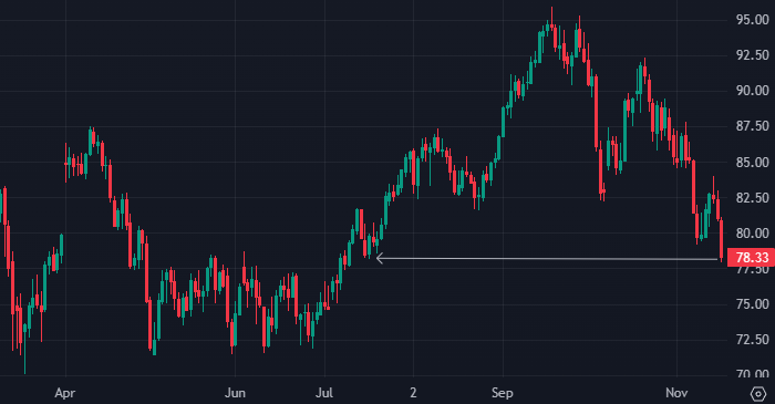 В результате этих событий котировки Brent и WTI опустились ниже психологически важных уровней $80 и $75 за баррель соответственно. Что более важно, цены на нефть теперь находятся примерно в той области, где ОПЕК+ ранее объявлял о сокращении добычи в начале апреля и июня. Ближайшее заседание альянса пройдет 26 ноября, и на нем мы как минимум можем услышать оценку происходящих событий со стороны его членов.