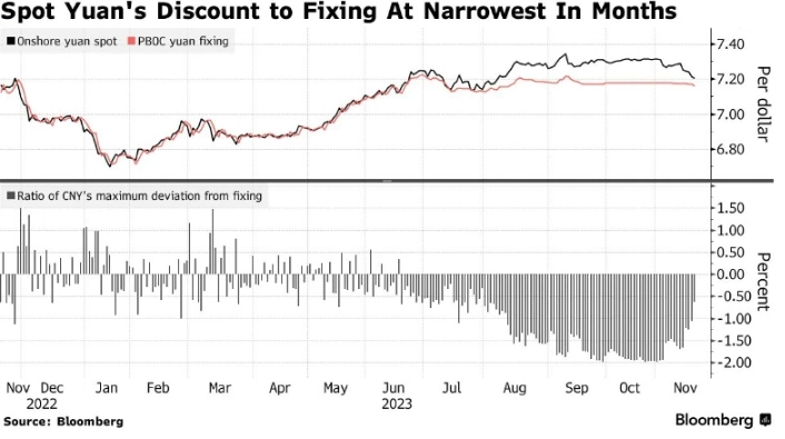 В понедельник континентальный юань укрепился до трехмесячного максимума около 7,1774 по отношению к повсеместно слабому доллару США, почти нивелировав дисконт к ежедневному справочному паритетному курсу, устанавливаемому Народным банком Китая. Менее месяца назад валюта торговалась вблизи слабого края диапазона в 2% от паритетного курса.