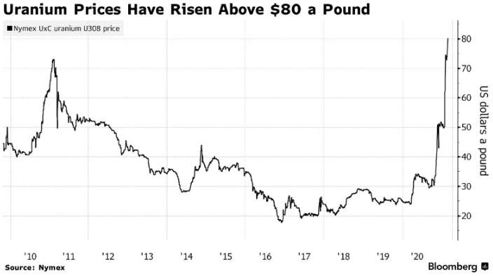 Фьючерсы на NYMEX, отслеживающие контракты физического рынка на необработанную форму урана, известную как жёлтый кек, в понедельник достигли $80,25 за фунт. В этом году цены резко выросли, достигнув уровня, невиданного с тех пор, как авария на Фукусиме в Японии заставила правительства всего мира сократить использование ядерной энергии.