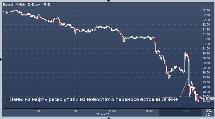 Организация стран-экспортеров нефти и ее союзники сталкиваются о все более хрупкой картиной цен на нефть. Нефть упала примерно на 18% по сравнению с сентябрьским пиком до почти $80 за баррель в Лондоне, что противоречит ожиданиям того, что сокращение добычи приведет к быстрому ужесточению ситуации с предложением на рынках. Перспективы спроса на следующий год выглядят после серии разочаровывающих статданных еще более слабыми теперь. Есть возможность того, что сформируется профицит предложения нефти в первой половине 2024.