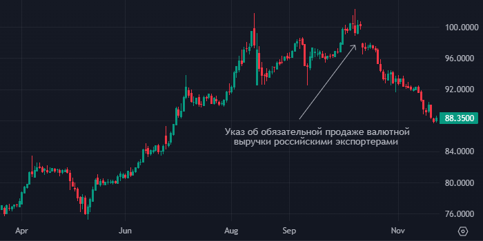 *ProFinance.ru: отметим, что устойчивый и быстрый рост российской валюты все же начался 12 октября, т. е. на следующий день после подписания Владимиром Путиным указа об обязательной продаже валютной выручки российскими экспортерами