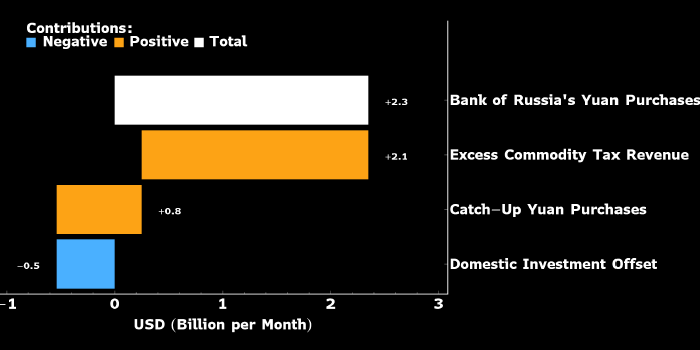 По оценкам Bloomberg Economics, в следующем году Банк России будет в среднем покупать юани на сумму, эквивалентную $2,3 млрд в месяц, что по итогам всего года составит около $28 млрд. Это поглотит значительную часть ограниченного предложения иностранной валюты, которую получают российские экспортеры.