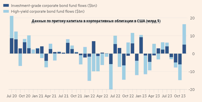 Инвесторы вкладывают средства в американские фонды корпоративных облигаций самыми быстрыми темпами более чем за три года, что свидетельствует об усилении интереса к рискованным активам, поскольку рынки прогнозируют пик процентных ставок. По информации поставщика данных EPFR, за месяц до 20 ноября в фонды корпоративных облигаций поступило более $16 млрд: это более крупный чистый приток, чем за любой полный месяц с июля 2020 года.