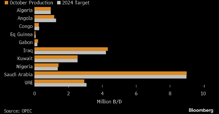 Объем добычи нефти членами ОПЕК в октябре (оранжевым) и их квоты на 2024 год (серым) в млн б/д. Данные: ОПЕК, источник: Bloomberg