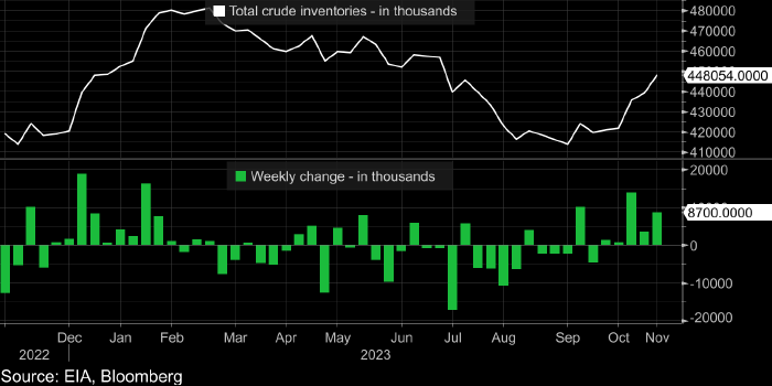 Коммерческие запасы сырой нефти в США (вверху, в тыс. баррелей) и их недельное изменение (внизу, в тыс. баррелей). Данные: Минэнерго США, источник: Bloomberg