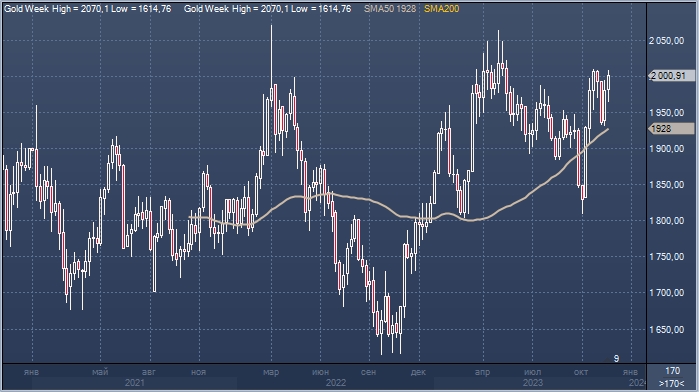 Золото превысило ключевой уровень в $2000 на торгах в пятницу, зафиксировав второй недельный прирост подряд. Удорожанию желтого металла способствует дешевеющий доллар, поскольку у участников рынка растет уверенность в том, что ФРС достигла пика повышения ставок.