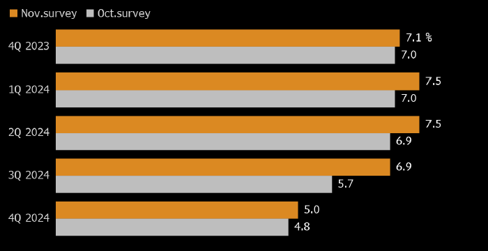 Консенсус-прогнозы по среднему уровню инфляции в РФ экономистов, опрошенных агентством Bloomberg (оранжевым — ноябрьский опрос, серым — октябрьский). Источник: Bloomberg