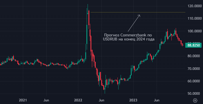 В среднесрочной перспективе Commerzbank ждет сокращения процифита счета текущих операций РФ, которое окажет давление на рубль. Текущие прогнозы банка выглядят следующим образом: