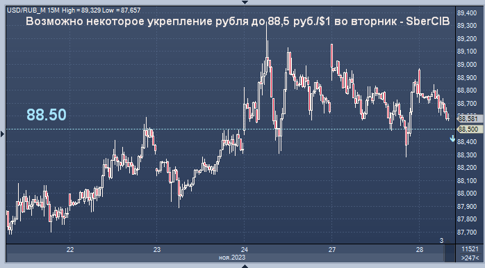 Возможно некоторое укрепление рубля до 88,5 руб./$1 и сохранение котировок нефти в диапазоне $80-81 за баррель Brent во вторник, пишут эксперты SberCIB Investment Research.