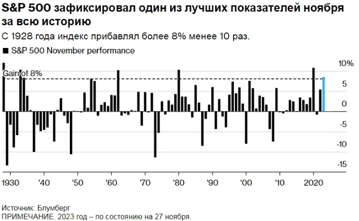 Американские акции выросли более чем на 8% в ноябре, что стало одним из самых сильных приростов за месяц с момента начала фиксации рекордных показателей, благодаря ожиданиям формирования пика процентными ставками и устойчивому экономическому росту. Однако в последние несколько дней рост индекса S&P 500 застопорился, поскольку инвесторы обеспокоены состоянием здоровья потребителей в США в период, когда приближается решающий сезон праздничных покупок.