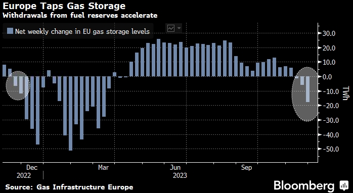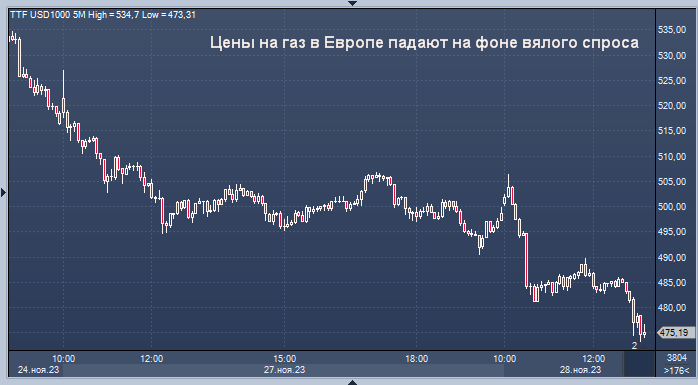 Европейские фьючерсы на природный газ продолжили снижение на фоне вялого прогноза спроса, при этом агентство Bloomberg Intelligence ожидает, что потребление топлива в этом году снова сократится после рекордного падения в 2022 году.