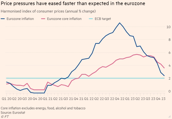 Резкое падение с 2,9 процента месяцем ранее усиливает надежды инвесторов, что ставки будут скоро снижены не только ЕЦБ, но и центральными банками, стремящимися сохранять высокие затраты по займам до тех пор, пока самый большой всплеск инфляции за последнее поколение не будет окончательно обуздан.