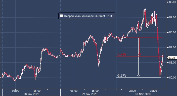 Февральские фьючерсы на нефть марки Brent упали на 1,5% до уровня ниже $81,35 за баррель. Формально активным контрактом остается январский, но он экспирируется как раз 30 ноября, там уже нет объемов и его динамика не отражает реакцию рынка.