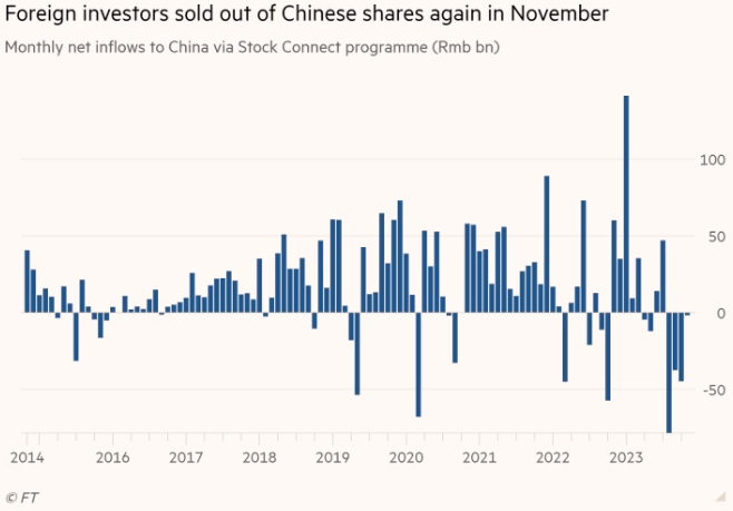 Диаграмма ежемесячного чистого притока в Китай через программу Stock Connect (млрд юаней), показывающая, что иностранные инвесторы снова продали китайские акции в ноябре.