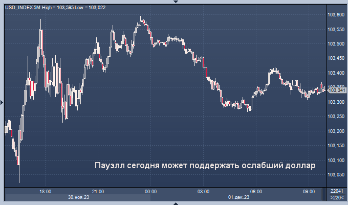 Индекс доллара, который измеряет курс американской валюты по отношению к шести конкурентам, снизился на 0,116% до 103,33 после демонстрации самого слабого месячного результата за год в ноябре, несмотря на скачок на 0,6% за ночь.