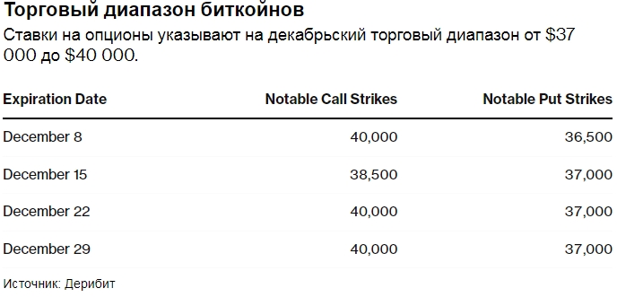 Структура позиций на рынке биткойн-опционов намекает на торговый диапазон от 37 000 до 40 000 долларов в декабре. Трейдеры, покупающие бычьи опционы колл со страйком в $40 000, явно готовы принять другую сторону ставки, указывая на то, что этот уровень станет ключевым отправным уровнем для возрождения биткойна.