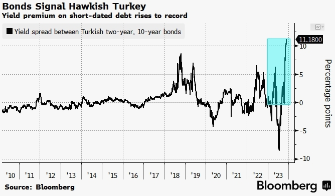 Однако участники долгового рынка Турции убеждены в решимости Центробанка бороться с инфляцией, что подразумевает возвращение к благоприятной для рынка политике. Спред доходности между 2-летними турецкими облигациями (они наиболее чувствительны к изменению процентной ставки ЦБ) и 10-летними облигациями превысил 1100 базисных пунктов — рекордный максимум с 2010 года. Это произошло после того, как ЦБ Турции в шестой раз (с мая 2023 года) повысил ставку и довел ее до 40%.