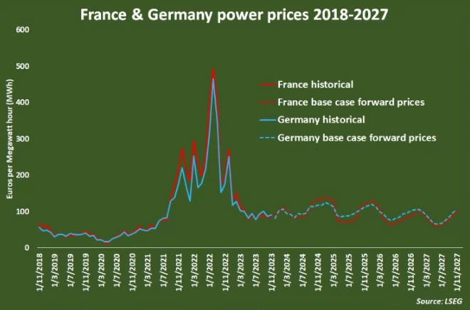 По данным LSEG, базовые оптовые цены на электроэнергию в Германии и Франции, двух крупнейших экономиках региона, на первый квартал 2024 года составляют в среднем 102 и 105 евро за мегаватт-час (МВт-ч) соответственно.