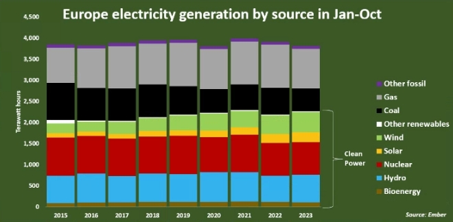 Чистые источники энергии произвели рекордные 59,3% электроэнергии в Европе за первые 10 месяцев 2023 года и могут превысить отметку в 60% к концу года, если ветроэнергетика в декабре сезонно увеличит выработку, свидетельствуют данные Ember.