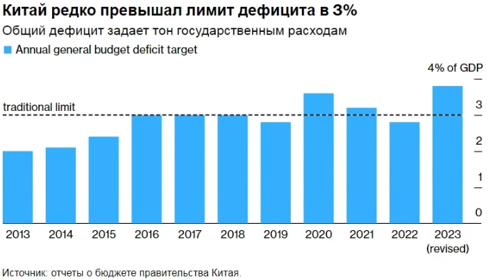 В октябре президент Китая Си Цзиньпин дал понять, что резкое замедление роста экономики и сохраняющиеся дефляционные риски недопустимы, и правительство увеличило общий бюджетный дефицит до самого большого за три десятилетия. Соотношение дефицита к ВВП в 2023 году составит 3,8%, что значительно превышает давно соблюдаемый предел в 3%.