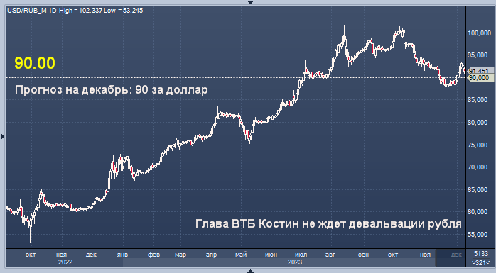 Оснований для значимого укрепления или ослабления рубля нет, до конца 2023 года курс будет в районе 90 рублей за доллар США, рассказал в четверг журналистам президент - председатель правления ВТБ Андрей Костин в кулуарах форума "Россия зовет!", организованного ВТБ. Укрепление курса рубля некоторое время назад г-н Костин объяснил подъемом ключевой ставки и введением требования об обязательной продаже валютной выручки экспортерами.