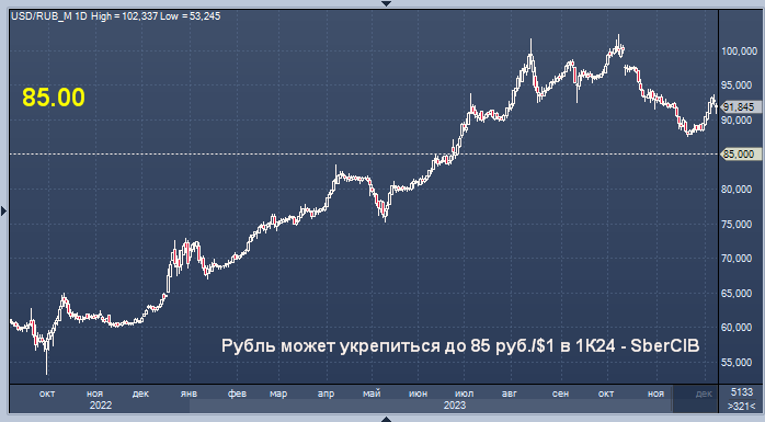 Рубль может укрепиться до 85 руб./$1 в I квартале 2024 года, полагают аналитики SberCIB Investment Research.