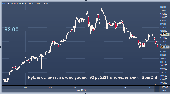 Курс пары доллар/рубль, вероятно, останется около уровня 92 руб./$1 в понедельник, а котировки нефти Brent останутся в диапазоне $76-77/барр., прогнозируют эксперт SberCIB Investment Research.