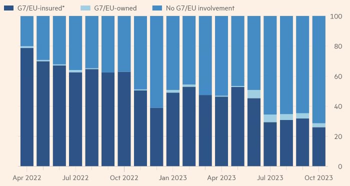 Почти повсеместное нарушение ценового потолка стало возможным из-за слабости правоприменения, а также из-за успеха России в создании теневого флота из таких судов, как Astro Sculptor, для перемещения своей нефти за пределы досягаемости G7.